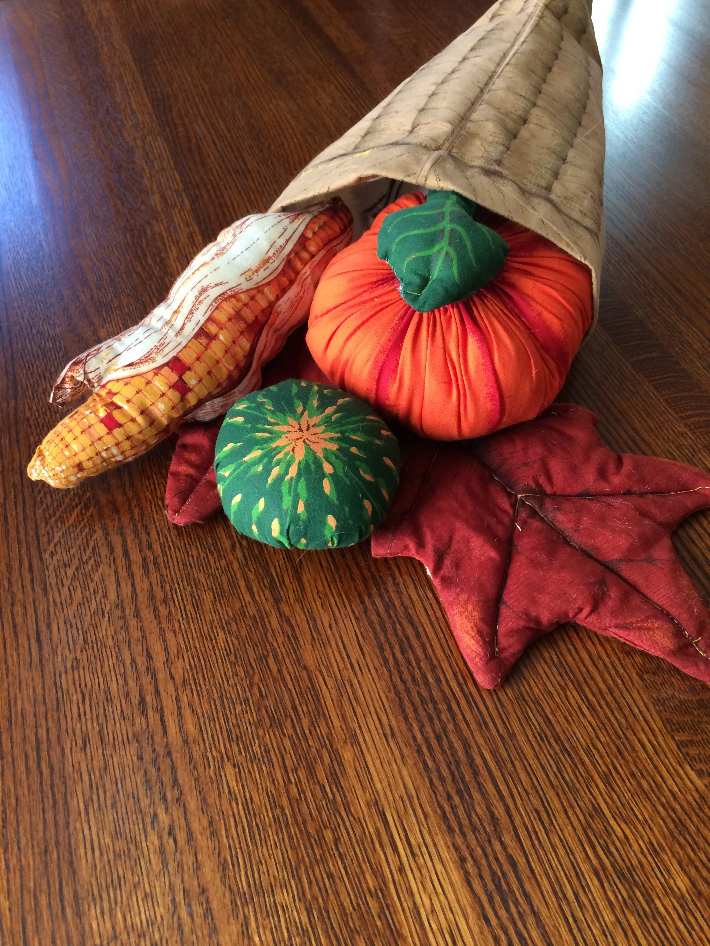 Years ago my mom bought a cut and sew project with all of the components to make a cloth cornucopia. She used batting to shape the vegetables and horn of plenty.